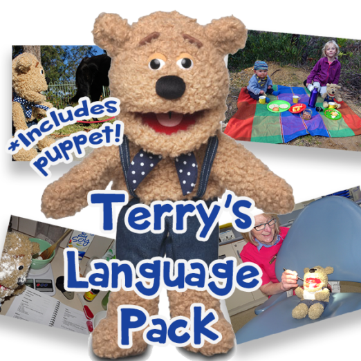 Chat TO Terry... Chat THROUGH Terry. Explore what Terry has been up to by looking at 20 photos. Terry's Language Pack is a favourite language resource for children in their first and second year of schooling. It comes with the cutest teddy bear puppet seen in any Australian school and a USB stick crammed full of language tasks and photos to view and/or print. (If you don't have a USB port, we can send you the data via a downloadable link).The language tasks in Terry's Language Pack are written to target the learning goals of the Language and Literacy strands of the Foundation and Year One levels of the current Australian Curriculum. You receive:20 photos to print or view on a device 400 language tasks outlined in a 69 page manual a high quality (and super cute) teddy bear puppet to be used by adults or sent home with children